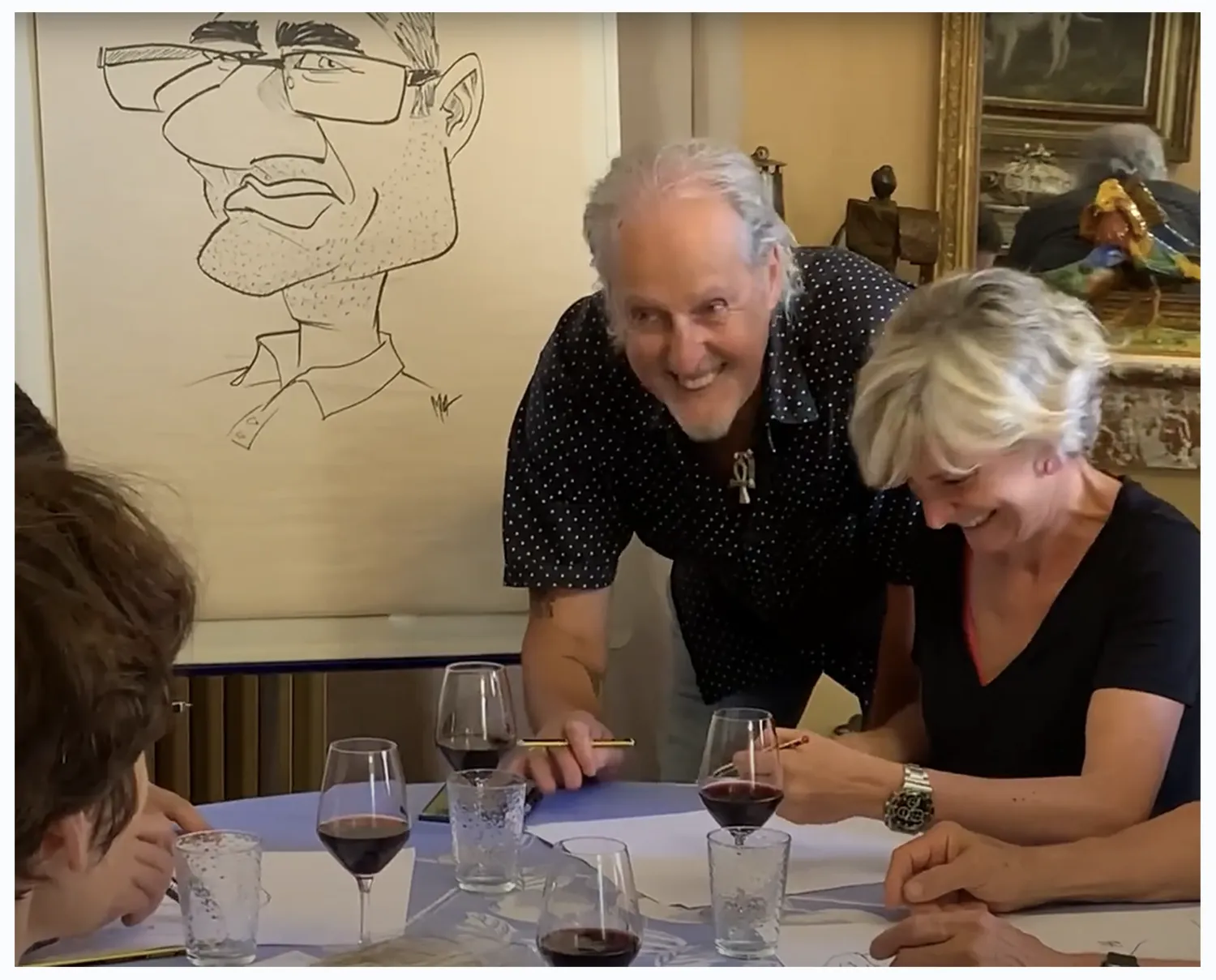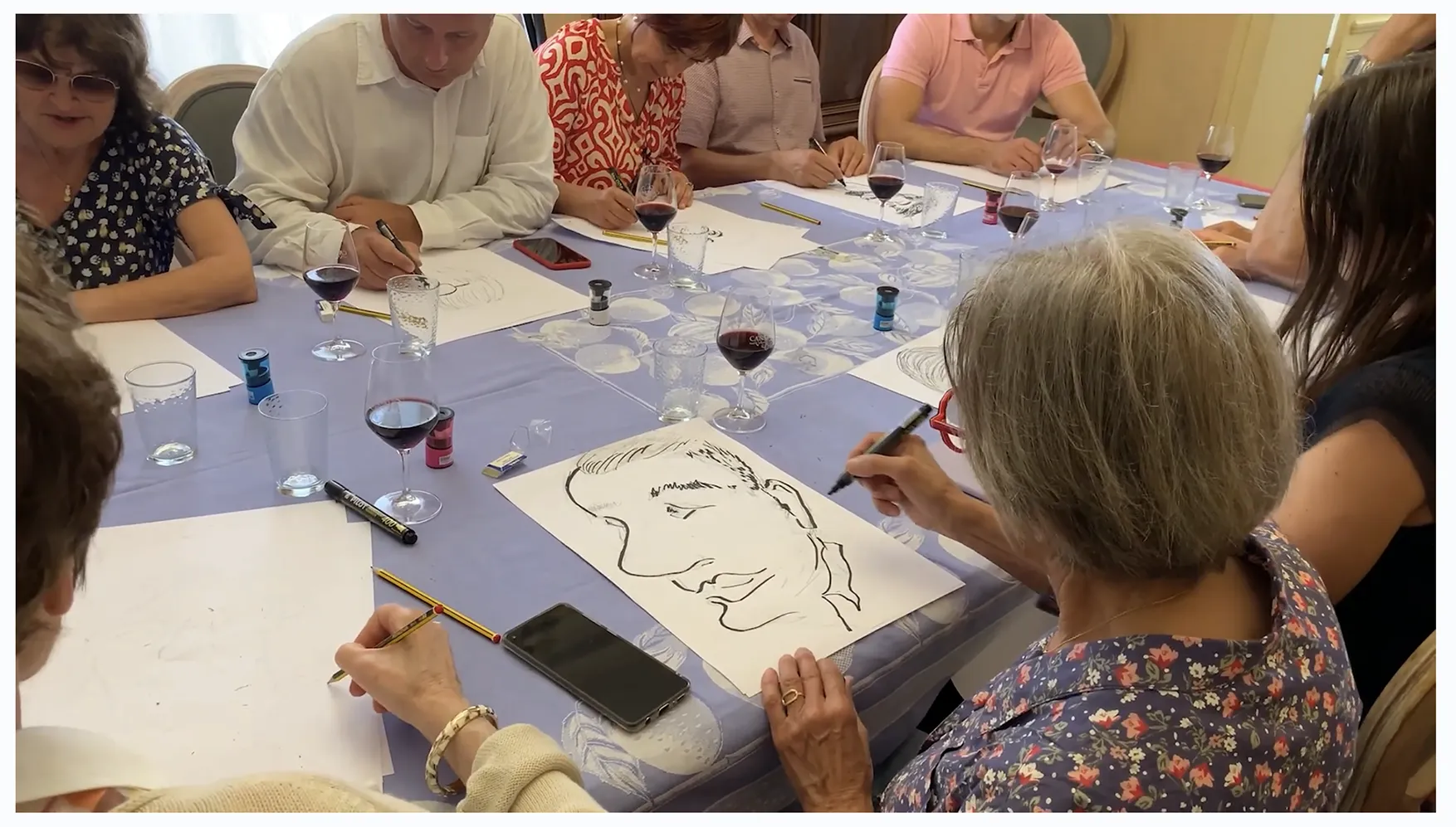 En direct sur iPad (avec projection sur grand écran) ou sur papier traditionnel, (aux marqueurs ou colorisé avec VIN) je croque vos invités avec bienveillance.